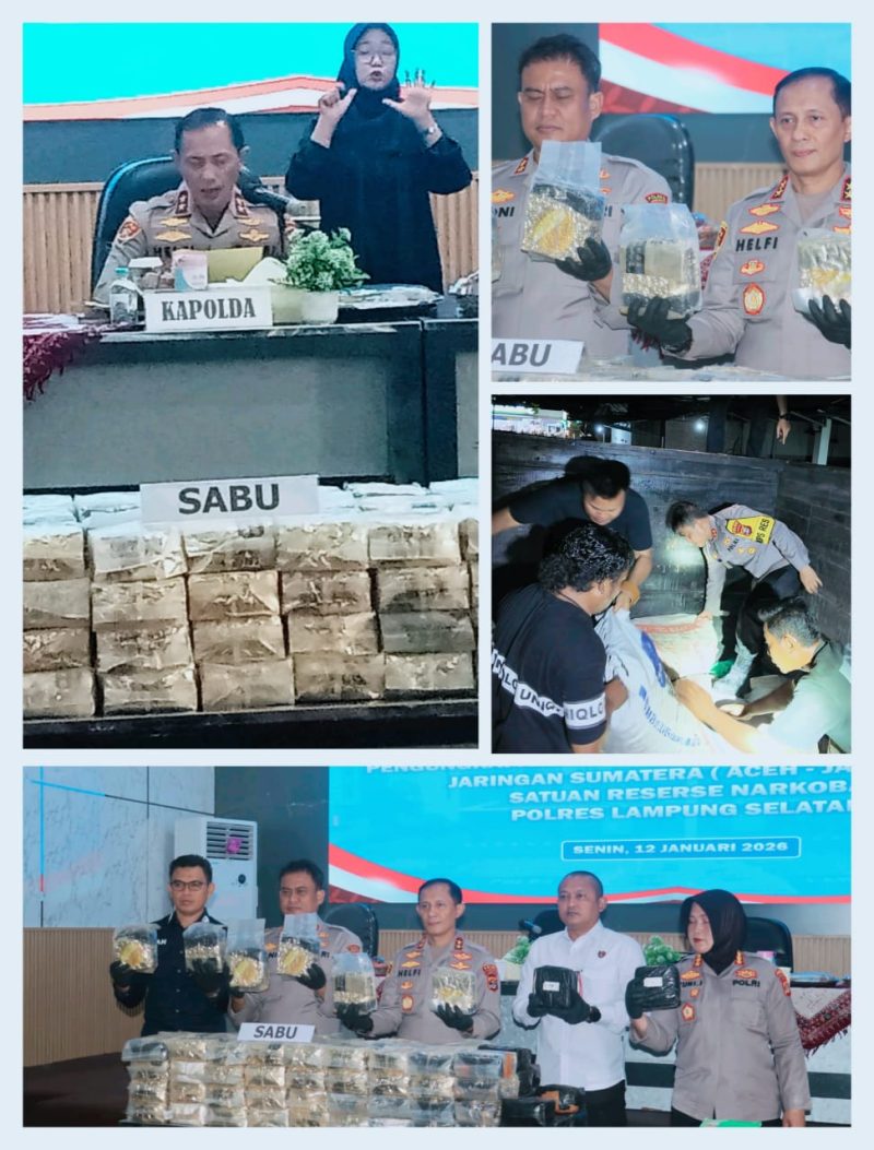 Pengungkapan kasus besar tersebut disampaikan langsung oleh Kapolda Lampung yang didampingi Direktur Reserse Narkoba Polda Lampung, Kabid Humas Polda Lampung, serta Kapolres Lampung Selatan, dalam press release pada Senin (11/1/2026) di Aula Radin Intan, Polres Lampung Selatan.