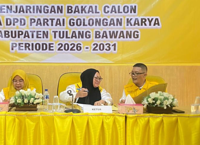 “perlu kami sampaikan bahwa DPD Partai Golkar Kabupaten Tulang Bawang membuka penjaringan Bakal Calon Ketua DPD Partai Golkar Kabupaten Tulang Bawang. Untuk pengambilan formulir dijadwalkan pada hari Senin, (27/04/26) dan untuk pengembalian formulir pendaftaran pada hari Selasa, (28/04/26) bertempat di Kantor Golkar Kabupaten Tulang Bawang” terang Ernawati.