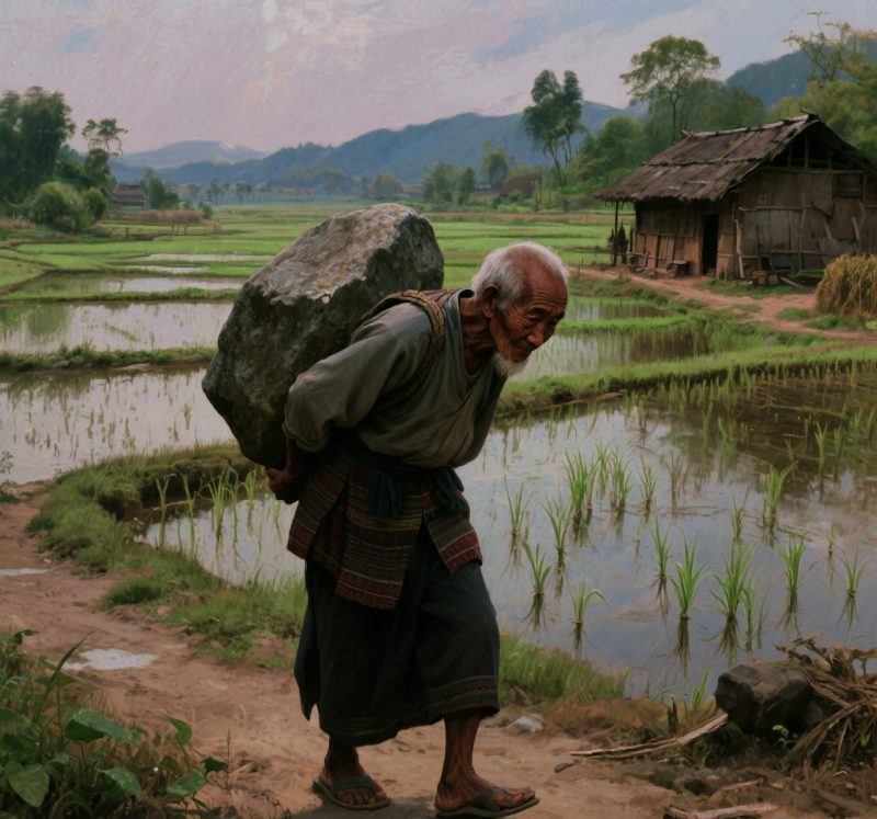 Tangannya yang keriput, penuh bekas luka dan keringat, memegang gagang ember dengan kuat. Dia menarik napas dalam-dalam suaranya seperti angin yang melewati celah batuan lalu hempas badannya ke depan. Batu itu terangkat sedikit, lalu dia memutar badannya, memindahkannya ke tempat yang sudah ditentukan. Kerja berat. Dari pagi sampai sore. Tanpa jeda. Tanpa mengeluh.