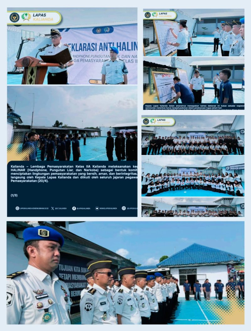 Kalianda, Seruntingnews.id – Lembaga Pemasyarakatan Kelas IIA Kalianda melaksanakan kegiatan Deklarasi Anti HALINAR (Handphone, Pungutan Liar, dan Narkoba) sebagai bentuk komitmen bersama dalam menciptakan lingkungan pemasyarakatan yang bersih, aman, dan berintegritas. Kegiatan ini dipimpin langsung oleh Kepala Lapas Kalianda dan diikuti oleh seluruh jajaran pegawai serta Warga Binaan Pemasyarakatan (20/4).