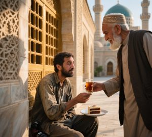 Baru beberapa menit kemudian, pedagang Pak Min datang ke masjid dengan segelas teh tawar yang hangat dan sepotong  roti yang masih panas. Dia bilang: “Kamu kelihatan lelah, nak. Ini buatmu –Ia berkata dari hati. Aku juga pernah ada di posisi mu dulu, nggak ada uang, nggak ada tempat cuma ada harapan” dan Tuhan.