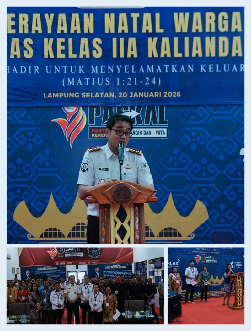 Kalianda, Seruntingnews.id — Lembaga Pemasyarakatan Kelas IIA Kalianda menggelar kegiatan ibadah dan perayaan Natal Tahun 2025 bagi warga binaan pemasyarakatan (WBP) beragama Kristiani, bertempat di Aula Lapas Kelas IIA Kalianda. Kegiatan ini terlaksana atas kerja sama dengan Kantor Kementerian Agama Kabupaten Lampung Selatan melalui Penyuluh Agama Katolik dan Kristen.