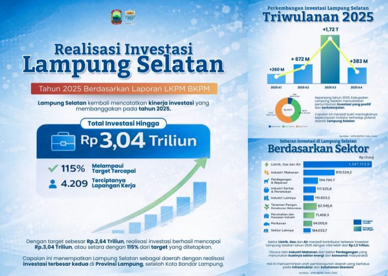 Realisasi investasi tahun 2025 tersebut juga berdampak pada penyerapan tenaga kerja sebanyak 4.209 orang. Peningkatan investasi ini tidak hanya mendorong pertumbuhan ekonomi daerah, tetapi juga berkontribusi langsung terhadap pembukaan lapangan kerja dan peningkatan kesejahteraan masyarakat Kabupaten Lampung Selatan.