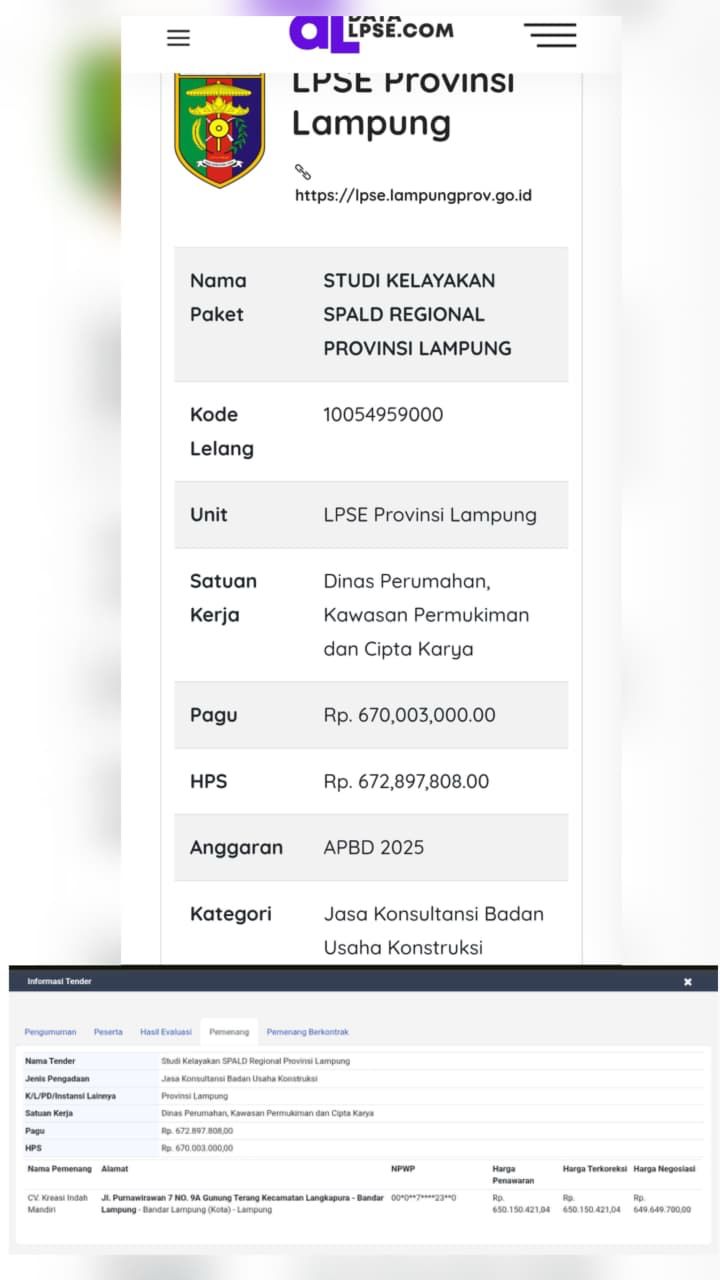 Berdasarkan data pada e-procurement/inaproc, tender Jasa Konsultansi Badan Usaha Konstruksi tersebut dimenangkan oleh CV. Kreasi Indah Mandiri, beralamat di Jl. Purnawirawan 7 No. 9A Gunung Terang, Kecamatan Langkapura, Bandar Lampung. Nilai harga penawaran tercatat Rp 650.150.421,04, sementara harga negosiasi akhir sebesar Rp 649.649.700,00.